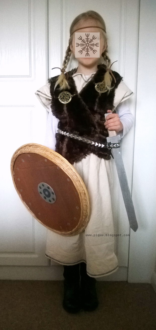 Viking Day at daughter's school. A few days of preparation and work. Searching of  Internet to find inspiration. Rummage at charity shops. Idea how to sew a dress I found on the website with the patterns of original medieval gowns. Over time the idea has simplified. Dress (tunic?) should be hand-sewed, but I used machine. Patterns around the bottom edge of the neckline and sleeves are also sewn on the machine. Shield was originally a laundry basket cover. Sword  has made by dad from plywood. Fur is a polyester not a dead animal. Everything we tried to do as close as it possible to historical reality, but with no exaggeration. But surely there is no helmet with horns, lol!